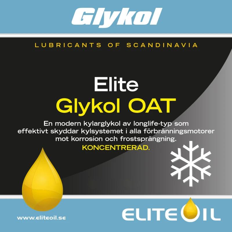 Elite Glykol OAT er ein glykol som oppfyller Volvos høgaste krav. Produktet er godkjent eller møter krava frå dei mest kjende bil- og lastebilprodusentane. Produktet kan blandast med dei mest vanlege OEM-godkjente kjølevæskene på marknaden. Elite Glykol OAT gir langvarig og effektiv beskyttelse mot korrosjon i systemet. Fungerer utmerka for både eldre og nye generasjonar av motorar. Blandinga bør ikkje vere mindre enn 33% konsentrat. Produktet inneheld ikkje nitrittar, aminar eller fosfatar. Farge: Svak gul.